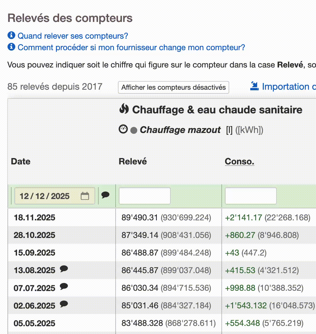 1. Les graphiques de consommation présentent la moyenne de consommation journalière entre deux relevés (et non plus les valeurs des relevés): on peut mieux se rendre compte de l'évolution de la consommation, même si les relevés ne sont pas réguliers.